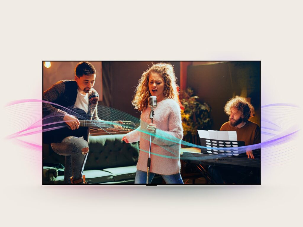 Esta tecnología, presente en modelos recientes como el QNED80, no se limita a subirle el volumen a las voces, sino que también crea un efecto envolvente que distribuye los sonidos ambientales hacia los lados y proyecta las conversaciones hacia el frente. El sistema de sonido detecta el diseño de tu habitación y el lugar donde está sentado para crear una cúpula de sonido a tu alrededor, perfectamente sintonizada con la acústica única de tu habitación.